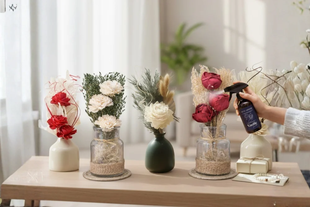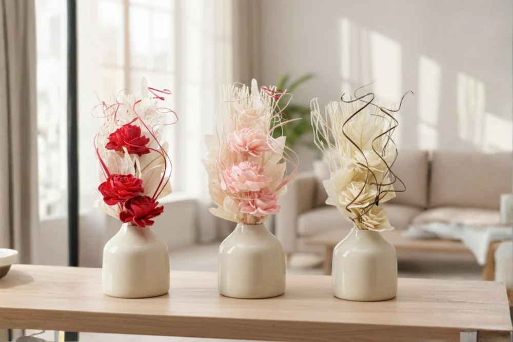 Spre deosebire de florile artificiale din plastic, florile din lemn de Sola sunt create manual dintr-un material natural, extras din interiorul unui arbust exotic, originar din Orientul Îndepărtat. Textura lor este fină, catifelată și extrem de receptivă la parfum. Aranjamente florale din lemn de Sola nu doar că arată incredibil de real, dar servesc și ca difuzoare naturale de aromă, păstrând esențele preferate pentru o perioadă îndelungată.