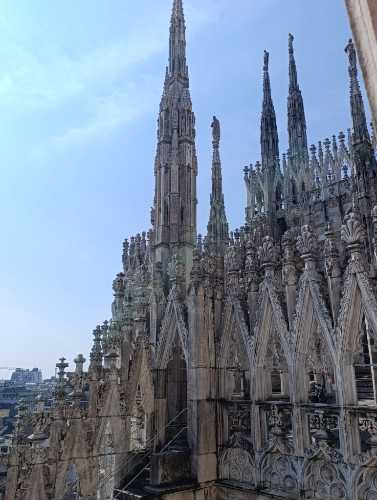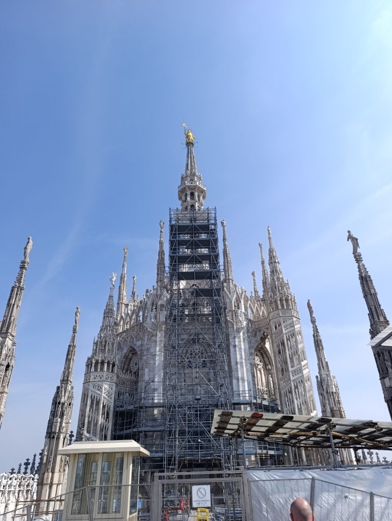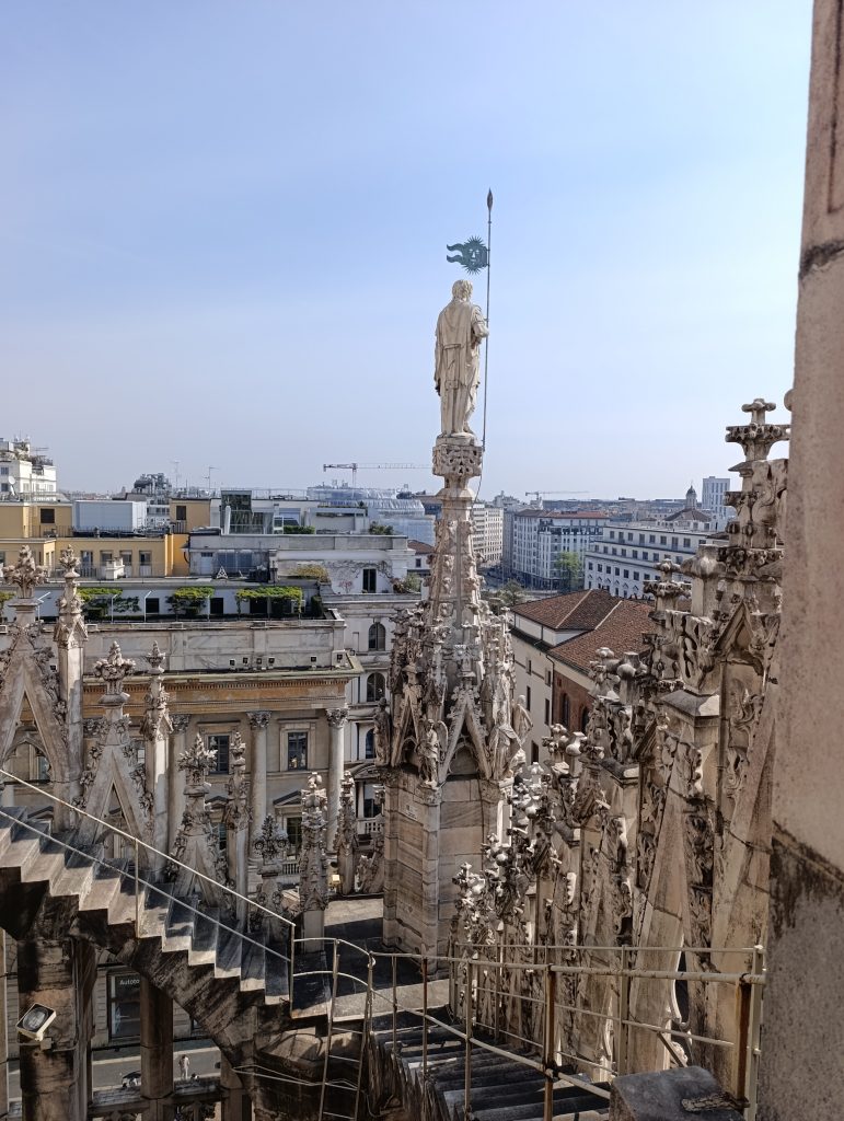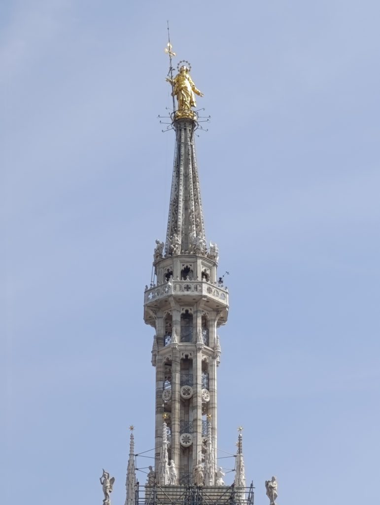 Odată ce am urcat pe ultima terasă a acoperișului catedralei, ni s-a desfășurat o largă panoramă a orașului . Cei mai mulți dintre vizitatori zăbovesc aici minute în șir pentru că din orice unghi privești, detaliile edificiului proiectate pe cer, te copleșesc prin frumusețe . Cea care străjuiește deasupra tuturor este statuia Madonninei , diminutivul folosit în această parte a Lombardiei pentru Fecioara Maria, considerată protectoarea orașului Milano. Este situată în cel mai înalt punct al Domului, pe „Tornul Lanternă”, la o înălțime de 108 metri. Statuia a fost proiectată de sculptorul Giuseppe Perego și a fost finalizată și instalată în decembrie 1774. Are o înălțime de 4,16 metri și este realizată dintr-o structură metalică, fiind acoperită cu plăci de cupru, care au fost ulterior poleite cu foiță de aur. Timp de secole a existat o regulă nescrisă ca nicio clădire din oraș să nu depășească înălțimea Madonninei. Când în cartierul financiar din Milano au fost ridicați zgârie-norii, pentru a respecta tradiția, o copie a statuii a fost plasată pe acoperișul celei mai înalte clădiri.