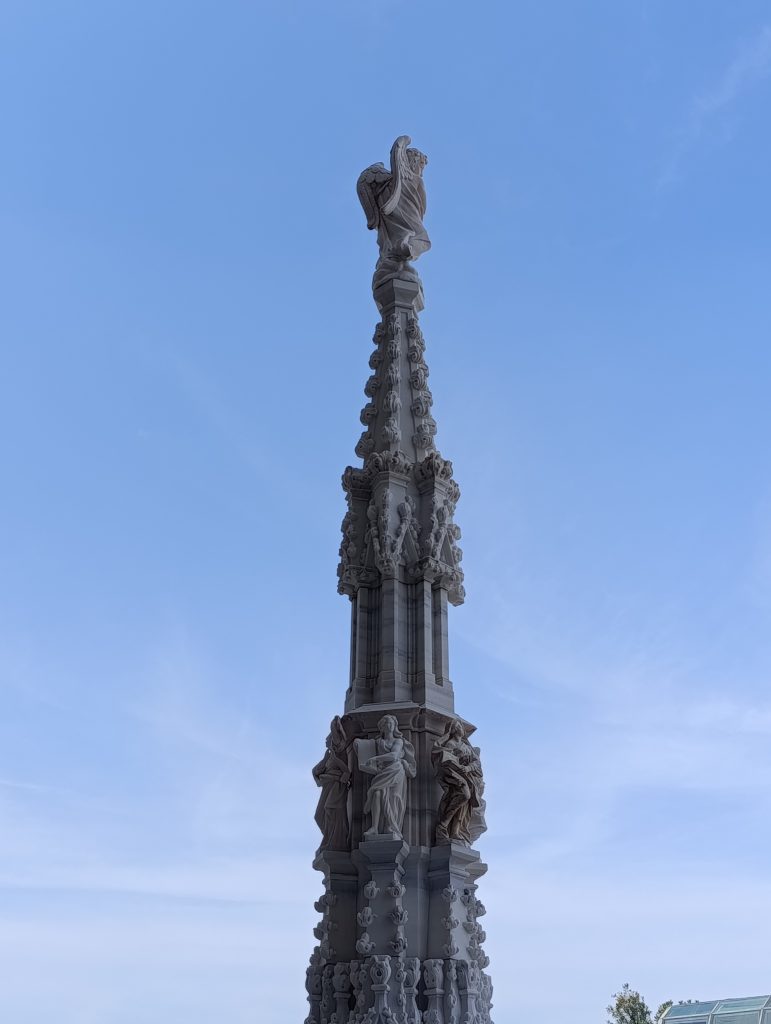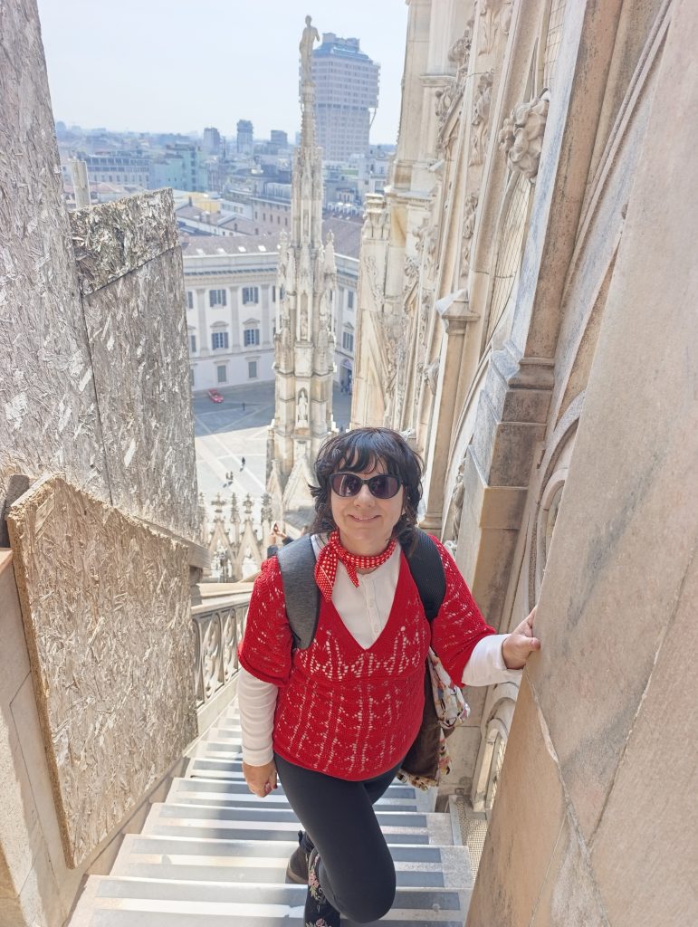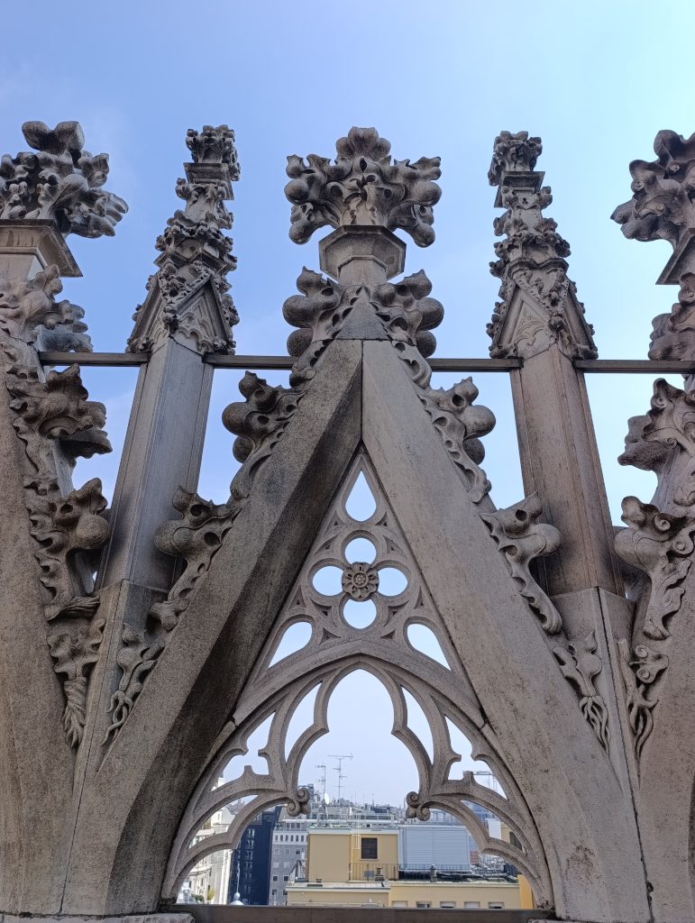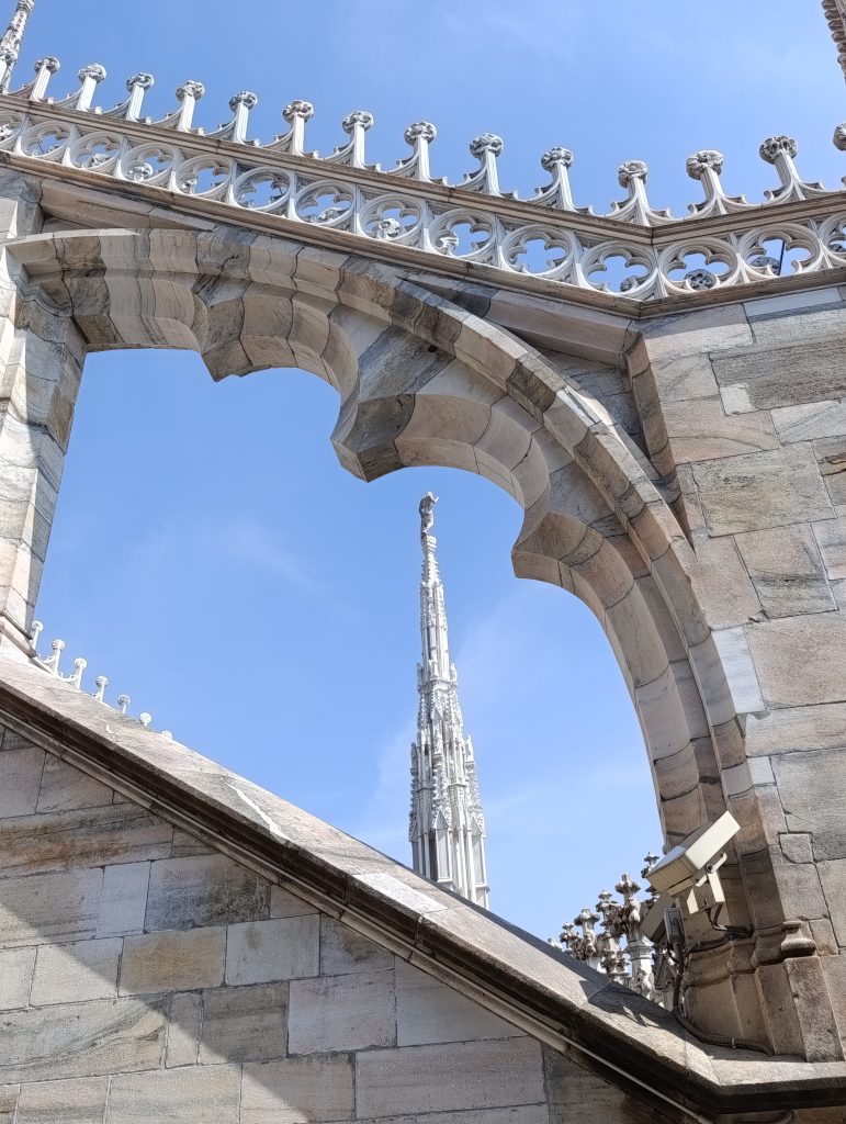 Odată ce am urcat pe ultima terasă a acoperișului catedralei, ni s-a desfășurat o largă panoramă a orașului . Cei mai mulți dintre vizitatori zăbovesc aici minute în șir pentru că din orice unghi privești, detaliile edificiului proiectate pe cer, te copleșesc prin frumusețe . Cea care străjuiește deasupra tuturor este statuia Madonninei , diminutivul folosit în această parte a Lombardiei pentru Fecioara Maria, considerată protectoarea orașului Milano. Este situată în cel mai înalt punct al Domului, pe „Tornul Lanternă”, la o înălțime de 108 metri. Statuia a fost proiectată de sculptorul Giuseppe Perego și a fost finalizată și instalată în decembrie 1774. Are o înălțime de 4,16 metri și este realizată dintr-o structură metalică, fiind acoperită cu plăci de cupru, care au fost ulterior poleite cu foiță de aur. Timp de secole a existat o regulă nescrisă ca nicio clădire din oraș să nu depășească înălțimea Madonninei. Când în cartierul financiar din Milano au fost ridicați zgârie-norii, pentru a respecta tradiția, o copie a statuii a fost plasată pe acoperișul celei mai înalte clădiri.