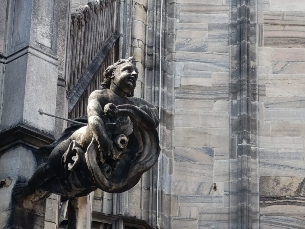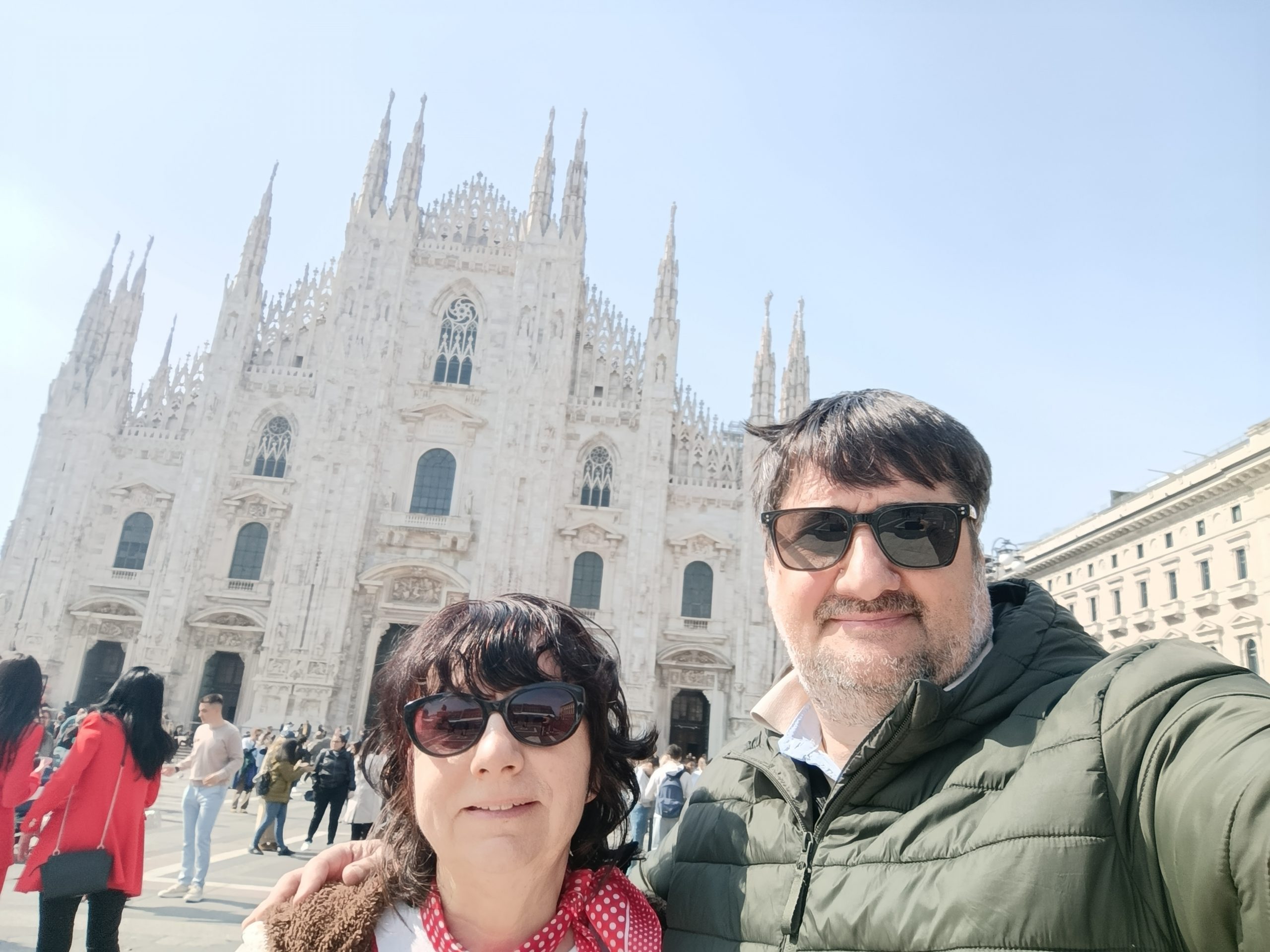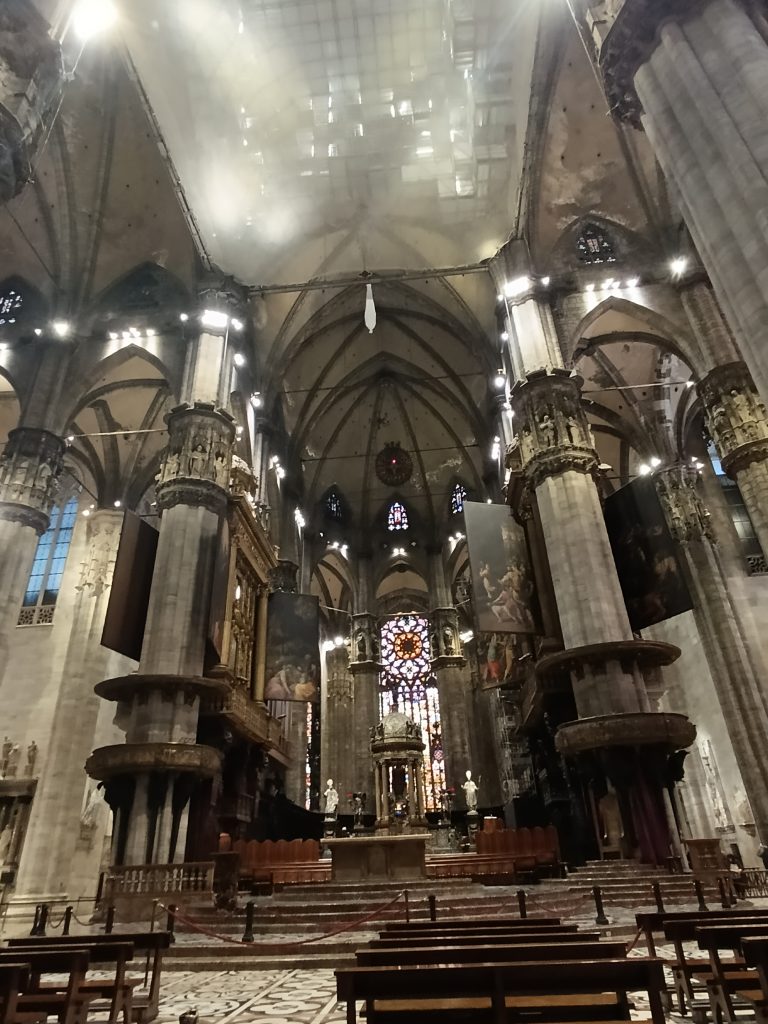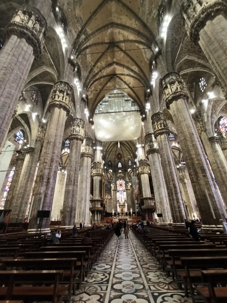 Domul din Milano este, fără drept de apel, bijuteria arhitectonică a orașului iar dantelăria sa din piatră m-a dus cu gândul la Sagrada Familia din Barcelona. Este în același timp simbolul spiritual al capitalei lombarde, fiind a treia cea mai mare biserică catolică din lume, ce impresionează prin dimensiuni și detaliile arhitecturale, de o finețe uluitoare. Construcția domului a început în 1386, la inițiativa lui Gian Galeazzo Visconti, și a durat peste 500 de ani, fiind finalizată oficial abia în secolul XX. Durata foarte mare de timp dar și numărul impresionant de arhitecți și artiști care au lucrat la ridicarea catedralei au avut ca rezultat un amestec de stiluri în care predomină goticul, cu influențe renascentiste și neoclasice. Noi ne-am bucurat de vizitarea lui într-o zi însorită, de care au profitat alte sute de turiști. Deși piața din fața catedralei părea ticsită de oameni, nu am simțit nici pe departe aglomerația. Poate pentru că nu era zgomot. Oamenii erau senini, zâmbeau și admirau în liniște frumusețea și măreția catedralei.