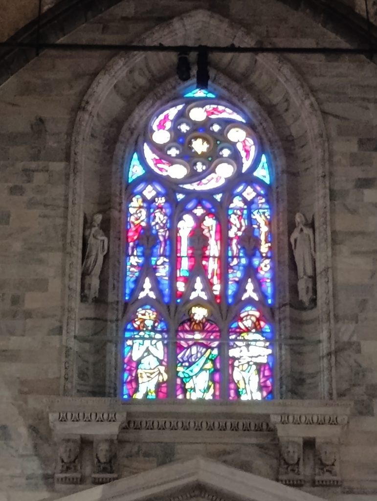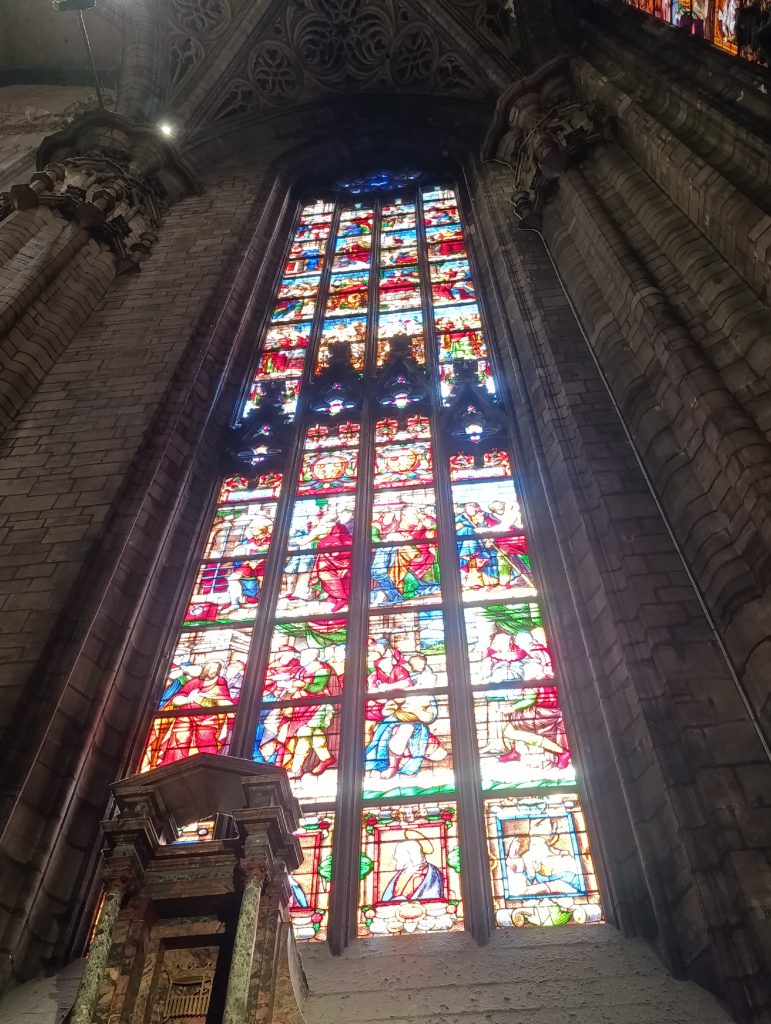 Domul din Milano posedă una dintre cele mai mari și spectaculoase colecții de vitralii din lume, ce datează din secolele XV-XVI, deși multe au fost restaurate ulterior din cauza uzurii. Numărul impresionant de vitralii imortalizează scene din Vechiul și Noul Testament, la realizarea acestora fiind folosite nuanțe intense de albastru, verde, roșu și auriu. Este greu de redat în cuvinte spectacolul cromatic pe care îl realizează lumina când pătrunde prin ele. Realizezi că expresia de „lumină mistică” a fost creată pentru acest fabulos joc de umbre și culori care transformă spațiul catedralei într-o experiență vizuală irepetabilă.